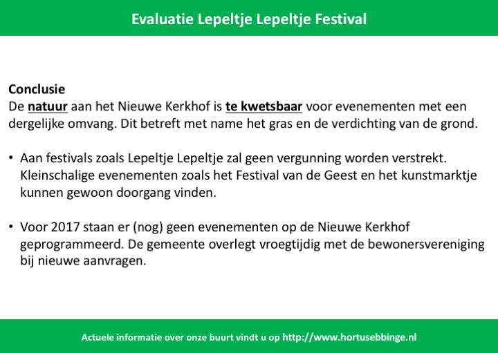 De gemeente heeft een gedegen evaluatie uitgevoerd. Conclusie: de natuur is te kwetsbaar voor dit soort festivals. Begin januari 2017 wordt onderstaande kaart in de buurt verspreid: