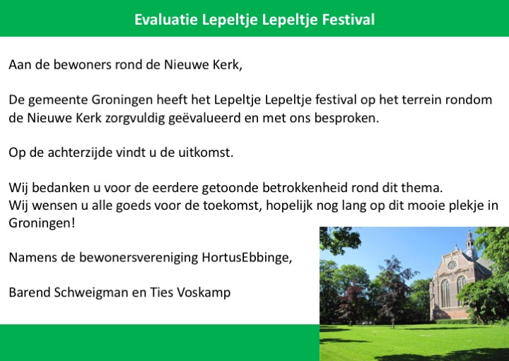Samen met de buurtvereniging gaan Barend Schweigman en Ties Voskamp in gesprek met de gemeente en de organisator. Het doel is de gemeente te overtuigen geen vergunningen voor dit soort evenementen met deze omvang op Nieuwe Kerkhof te verstrekken, maar andere gebieden hiervoor te benutten. In dit specifieke geval, maar ook als visie / beleid voor de toekomst.